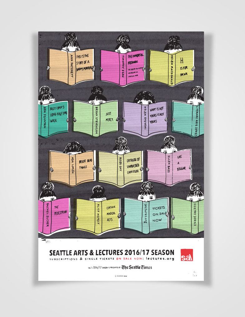 This poster is part of SVC’s Spring 2016 Poster Design-a-thon. Seattle Arts & Lectures printed and distributed the poster to announce the 2016/17 Season. —Art Direction by Jeff Kleinsmith & Sasha Barr