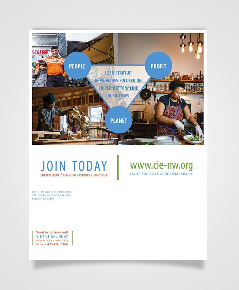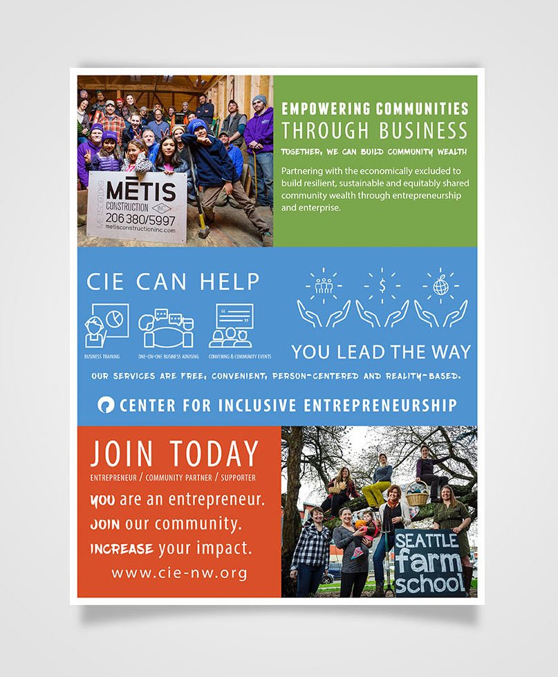The Center for Inclusive Entrepreneurship wanted an infographic brochure that communicated their values to their community in a universally accessible way. Client Comment: “You are awesome, Andrea. Thanks for ‘getting it’!” (Photographs provided by client.)
