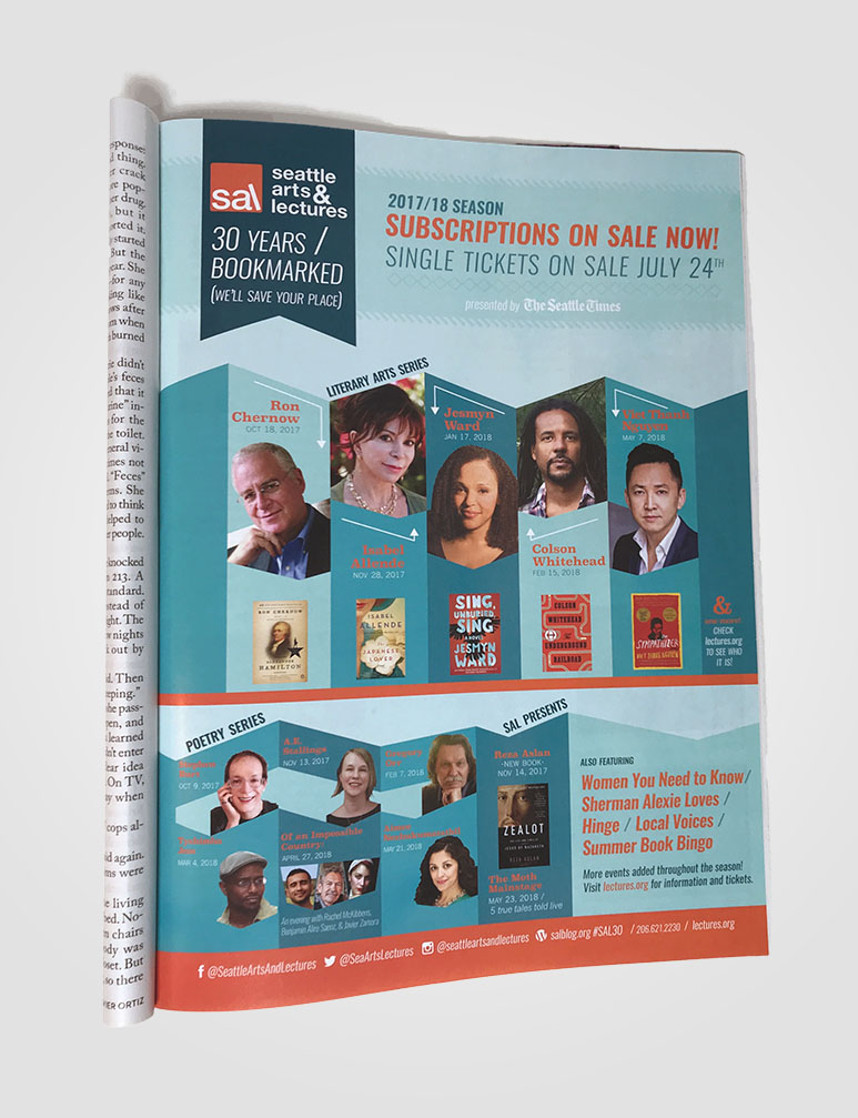 This ad was made in conjunction with the Season Brochure for Seattle Arts & Lectures' 2017/18 Season.